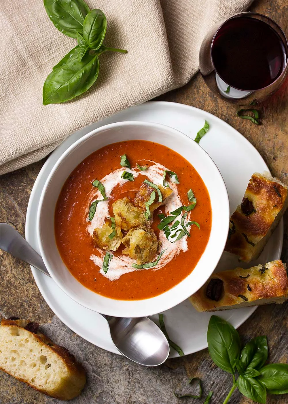- Serve with cream (for people to swirl into their bowls), sliced basil, and fried croutons.