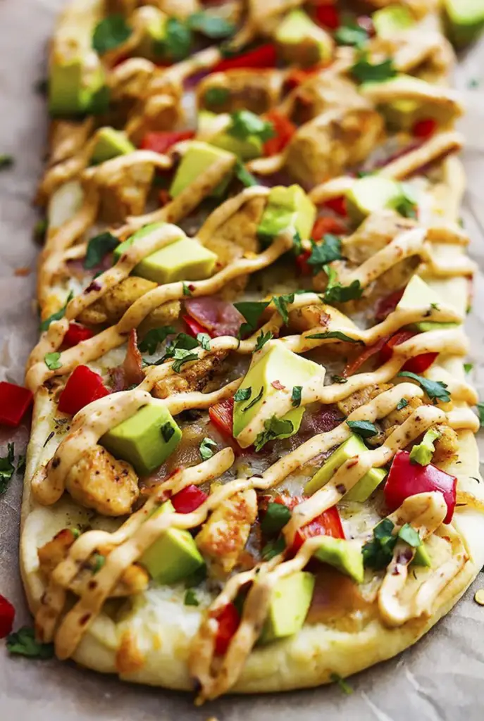 California Chicken Flatbread with Chipotle Ranch Sauce, juicy chicken, bacon, avocado, red peppers and cilantro , Black Truffle Oil . Just check out the star ingredient list… mozzarella cheese fresh…